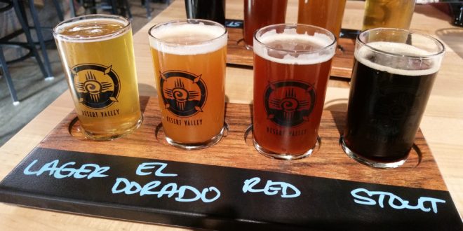 The Crew took flight, well, multiple flights at Desert Valley Brewing’s new west side taproom. The Crew was invited, en masse, to visit the new Desert Valley Brewing taproom on the west side Thursday night. We were able to put together a sizable collection of members — myself, Franz Solo, Luke, Andrew, Shawna — at the last minute to head over and try the food and beer. Desert Valley has been open less than two weeks. It will host an official grand opening this Saturday, with merchandise giveaways every half hour, half-price appetizers, live music, and more. For those wondering where it is located, if you remember where the old Stumbling Steer (later Vernon’s Open Door) sat off Ellison near Highway 528/Alameda, then you should be able to find Desert Valley. It occupies the southwest corner of the building at 3700 Ellison NW. The interior is warm and inviting. There are multiple televisions, making it an ideal spot for watching sports. They were divided between the dreadful Thursday NFL … |