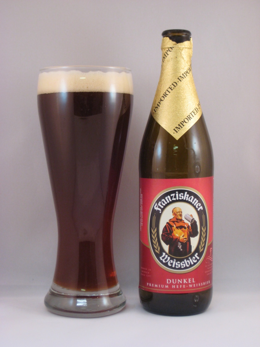 Commercial examples of this style include Weihenstephaner Hefeweissbier Dunkel, Ayinger Ur-Weisse, Schneider Weisse (Original), Ettaler Weissbier Dunkel, Hacker-Pschorr Weisse Dark, Tucher Dunkles Hefe Weizen, Edelweiss Dunkel Weissbier, Erdinger Weissbier Dunkel, and Kapuziner Weissbier Schwarz. We decided to sample Franziskaner Hefe-Weissbier Dunkel.