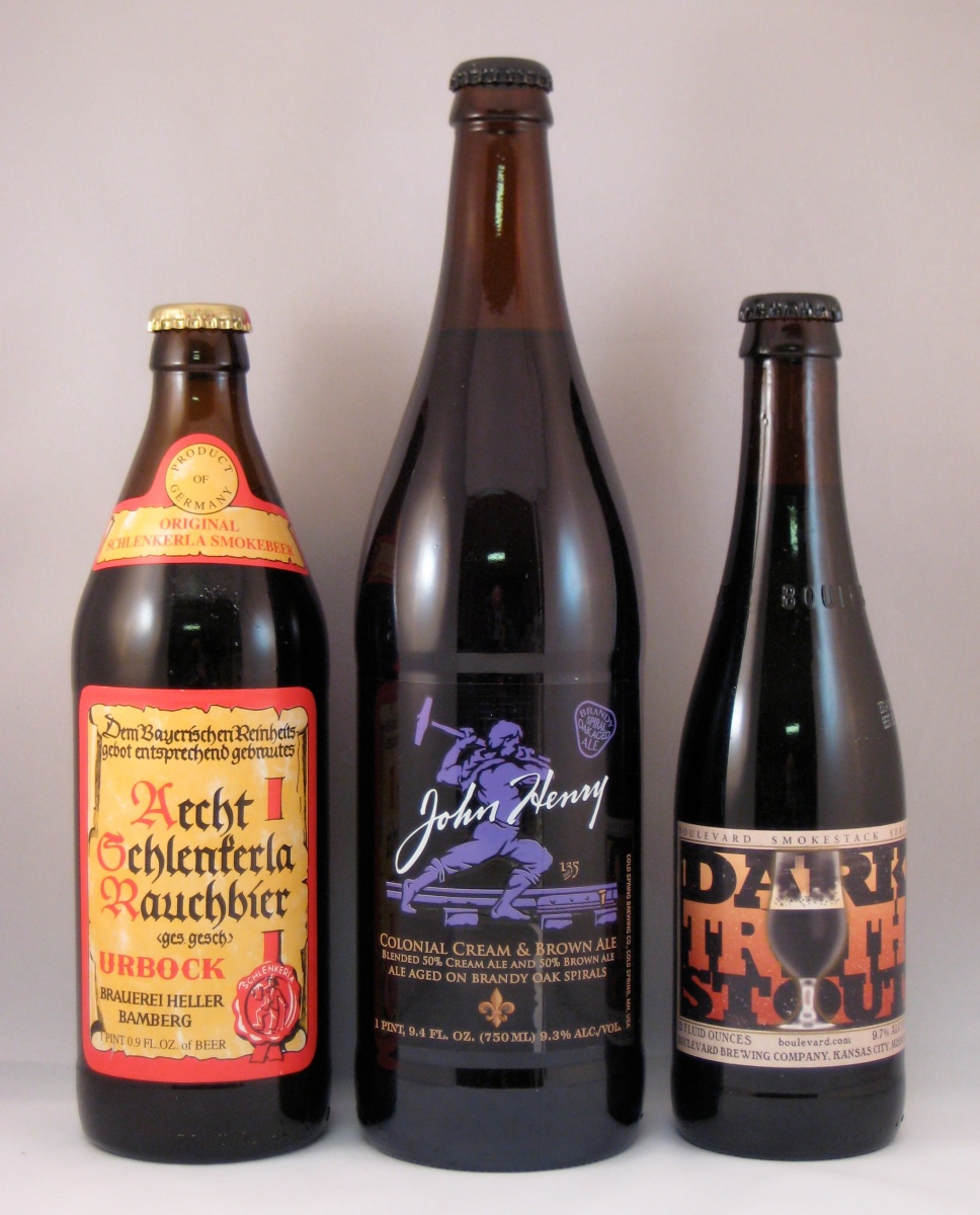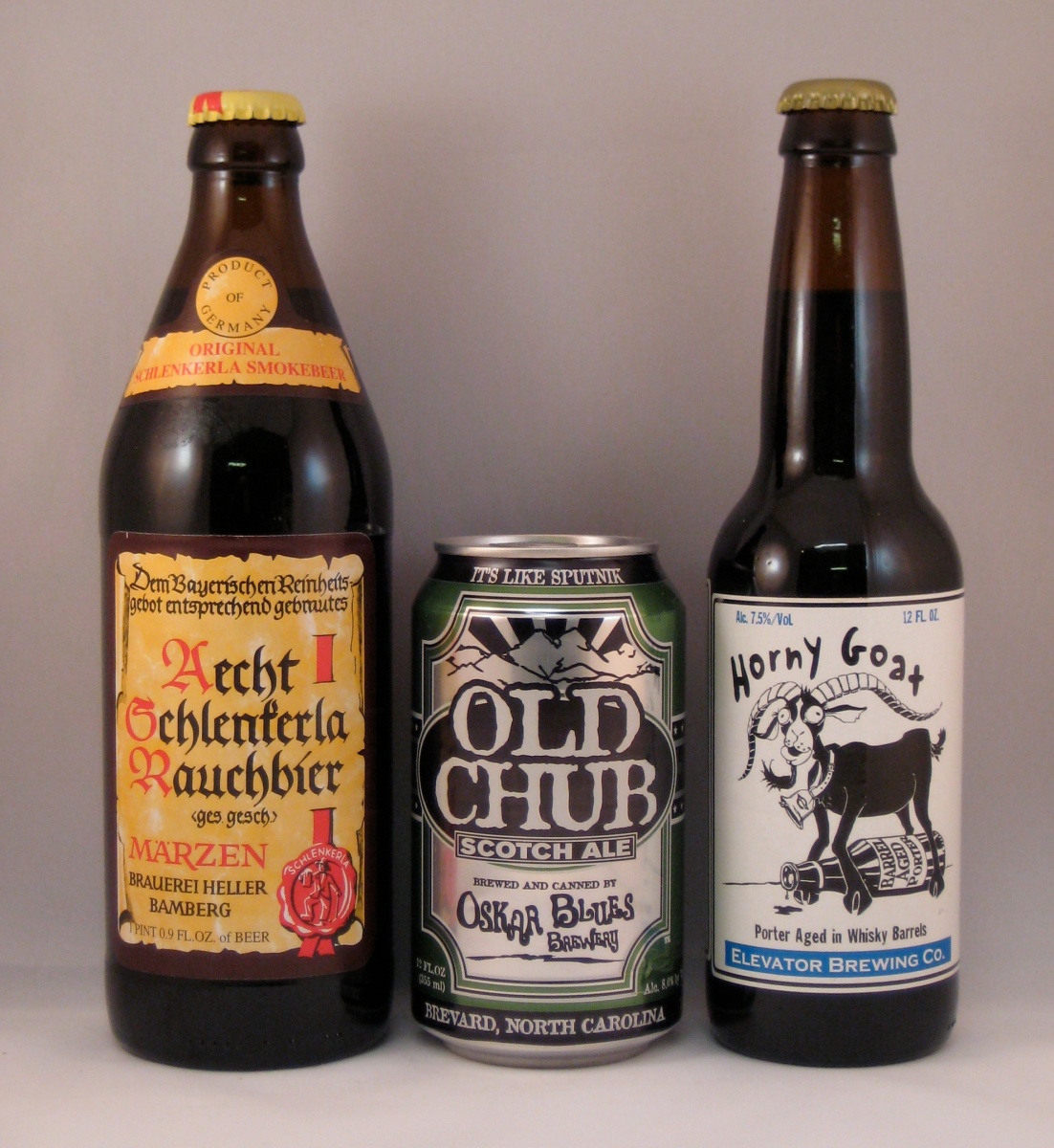 Commercial examples of this style include Alaskan Smoked Porter, O’Fallons Smoked Porter, Spezial Lagerbier, Weissbier and Bockbier, Stone Smoked Porter, Schlenkerla Weizen Rauchbier, Rogue Smoke, Left Hand Smoke Jumper, Dark Horse Fore Smoked Stout, and Magic Hat Jinx. We decided to sample Oskar Blues Old Chub Scotch AleBoulevard Dark Truth Stout and Schlenkerla Rauchbier Urbock.