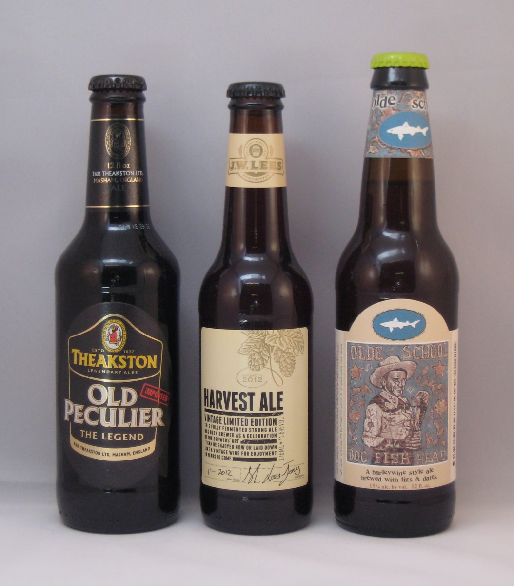 Commercial examples of this style include Thomas Hardy’s Ale, Burton Bridge Thomas Sykes Old Ale, Robinson’s Old Tom, Fuller’s Golden Pride, AleSmith Old Numbskull, Young’s Old Nick (unusual in its 7.2% ABV), Whitbread Gold Label, Old Dominion Millenium, and Weyerbacher Blithering Idiot. We decided to sample J.W. Lee’s Vintage Harvest Ale and North Coast Old Stock Ale.