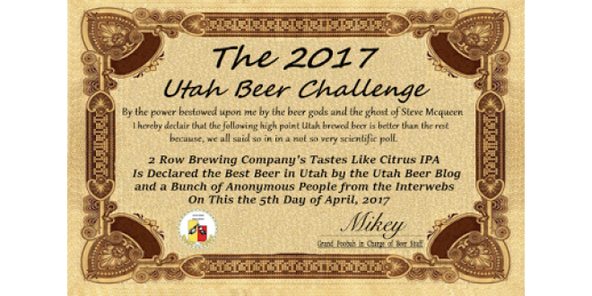 And the winning beer of the Utah Beer Challenges High Point Beer Competition is Tastes Like Citrus IPA from 2 Row Brewing Company. This juicy IPA has brilliant bitter citrus tones with a cloudy appearance. Big notes of peach, tangerine and tropical fruit, followed with a fluffy and full mouthfeel. This outstanding North East IPA is big on flavor and aroma. The final scores are updated into the bracket above. Brian, DeDe and Clay. I invite you take take this hastily made certificate of awesomeness and proudly display it over your shitter(s) or wherever you see fit. And just in case you’ve been living under a rock, I invite you, the readers to get your collective asses to 2 Row and experience this hoppy dream for realsies. The Utah Beer Beer Low Point Challenge begins tomorrow. All of you favorite session beers, right here in a battle to the death. Congrats again to 2 Row! I’d appreciate some feedback on doing High ABV vs High and Low vs Low, or any comments you may have. Prost! … |