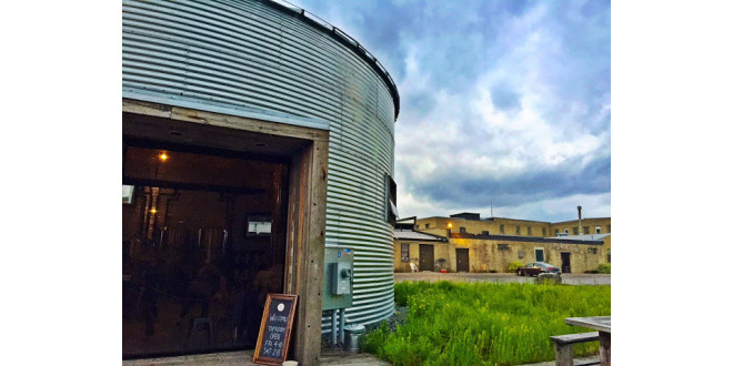 | On a recent trip to St. Paul (someplace I don’t tend to visit often) I finally had a chance to visit Bang Brewing. I first went to Urban Growler Brewery since they serve food and I was famished, but then discovered that Bang was only about 50 feet away! Of course in the time it took me to eat my lunch and have a half-pint of beer the skies had decided to dump a ton of cool and heavy rain upon me. I ran across the intervening distance, becoming drenched with rainfall, to the circular metal silo building, unsure if they were even open, or where the entrance was located.