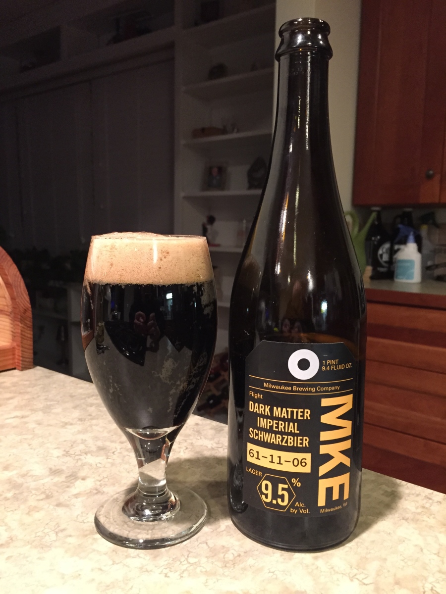 | Day 238: MKE Dark Matter Imperial Schwarzbier from Milwaukee Brewing Company. Style of beer is ‘Schwarzbier (Black Beer)’. ABV is 9.5%. |