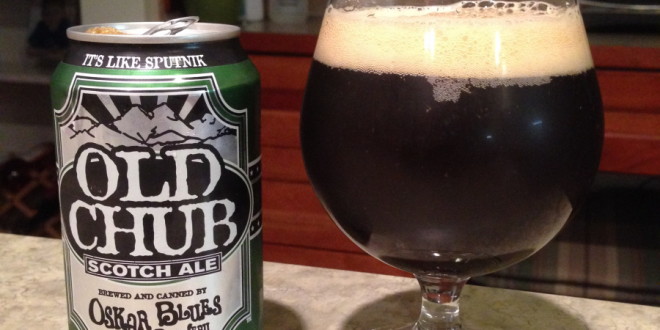 | Day 83: Oskar Blues Old Chub Scotch Ale from Oskar Blues Brewery. Style of beer is ‘Strong Scotch Ale’. ABV is 8.0%. |