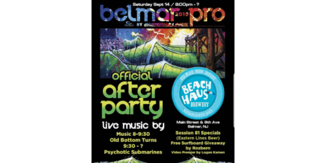 Belmar: Belmar Pro Official After Party is happening at Beach Haus Brewery John from Beach Haus Brewery said on Saturday, September 14 from 08:00 pm to 11:00 pm Join us on September 14th for the Official After Party to the 18th Annual Belmar Pro organizes by our good friends and Belmar Neighbors Eastern Lines Surf Shop. Pints of Session 81 IPA our collaboration beer with Eastern Lines Surf Shop will be featured. Live Music by Old Bottom Turns and Psychotic Submarines We are once again giving away a Rozbern surfboard and brewery swag. 15+ beers on tap • open-air deck overlooking downtown Belmar, NJ • Music & Fun evening About the Belmar Pro: The Belmar Pro is the second largest Surf Contest on the East Coast, drawing Pro Surfers from all over the World! More information can be found at at this link.