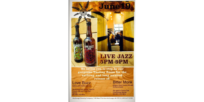 | Just got word from Gabe Fletcher about an event taking place tomorrow, Friday, June 19th, at Anchorage Brewing Company. Gabe will be releasing the next batches of both Bitter Monk DIPA and Love Buzz Saison! To celebrate, there will be live jazz music at the brewery from 5 to 9 PM. If you will be in Anchorage tomorrow evening, this sounds like a great time!