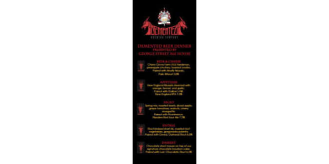 New Brunswick: Demented Beer Dinner is happening at George Street Ale House James from George Street Ale House said on Wednesday, April 18 from 07:00 pm to 09:30 pm Come and enjoy a delicious 5 course dinner with each course specially chosen to pair exceptionally well with one of Demented Brewing’s exceptional beers. The dinner will be hosted in a private space and a representative from the brewery will be giving some insight into the beers at the start of each course and will be bringing giveaways for all attendees! The price for the dinner is $49pp and includes the 5 course dinner as well as a 6oz pour of each pairing beer. Reservations are required for this event and space is limited. The restaurant is located at 378 George Street in New Brunswick. Call 732-543-2408 for info or visit the site, Facebook and Twitter. Don’t forget that NJCB Members get 10% off entire bill (cannot be combined with other offers)! Sign up today!