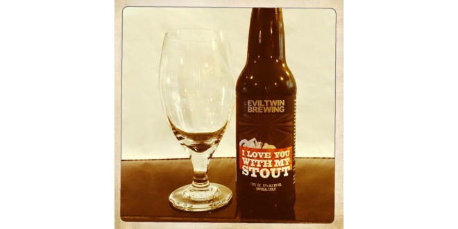 Tonight’s featured beer is Evil Twin Brewing I Love You With My Stout. I picked up a four pack of this beer at Santa Clara Liquors (here).