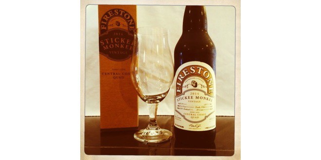 Tonight’s featured beer is Firestone Walker Brewing Company Stickee Monkee Barrel Aged Central Coast Quad. I grew incredibly impatient as I awaited the arrival of this newest barrel aged beer. I was fortunate enough to have a good friend that was making a trip to the brewery so he picked up this along with a few other Firestone Walker Brewing Company offerings for me. I have since purchased (and am now cellaring) A LOT of this beer.