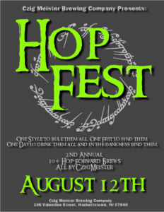 Hackettstown: HopFest at Czig Meister Brewing! is happening at Czig Meister Brewing Company Kirsten from Czig Meister Brewing Company said on Saturday, August 12 from 12:00 pm to 10:00 pm One Style to rule them all, One Fest to find them, Our 2nd Annual HopFest is August 12th! Join us as we feature over 30 hop-forward brews all created by Czig Meister! We’re more than doubling the number of hoppy delights this year as we once again take over all of our own taps. New beers will be going on throughout the day, so plan accordingly. Join Team NJCB including me, Gene, at the HopFest! Come say hi! More information can be found at https://www.facebook.com/events/237801060064257. Czig Meister Brewing offers NJCB Members $1 off all pours including 12oz pours, flights and growler fills at 106 Valentine St, Hackettstown.