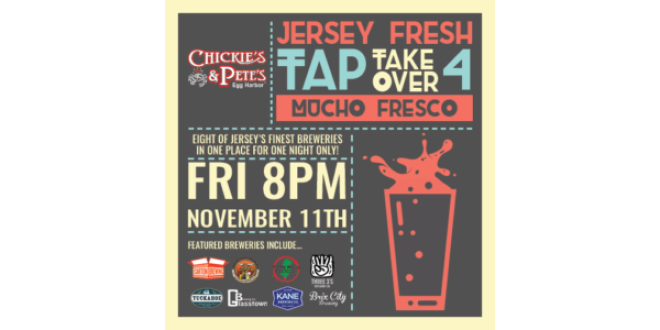 Egg Harbor Township, NJ: Jersey Fresh Tap Takeover 4: Mucho Fresco! is happening at Chickie’s and Pete’s EHT Alvin from Chickie’s and Pete’s EHT said on November 11 2016 from 08:00 pm to 02:00 am 8 NJ breweries from up and down the state, 4 of their rarest/newest offerings..If you were here for the mayhem last time, you know this thing will be big! Get here early… More information can be found at https://www.facebook.com/events/320299674993252/. Free order of their signature Crabfries, $2 off growlers & 10% off growler fills for NJCB Members at 6055 Blackhorse Pike, EHT.