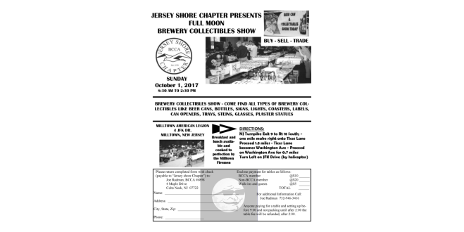 Milltown: The next Jersey Shore Chapter beer collectors show is October 1 from 8AM-2PM. There is usually plenty of beer. Come on by and give it a try. Details in this flyer.