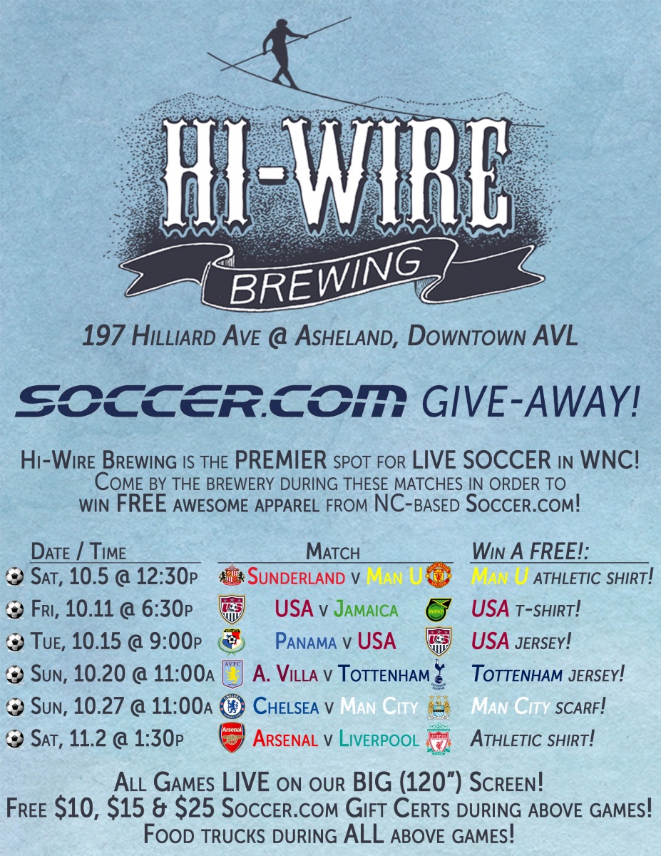 ASHEVILLE, NC, October 4, 2013 – Hi-Wire has partnered with soccer.com to give away a bunch of sweet merchandise and soccer.com gift certificates during some awesome upcoming soccer games at the brewery! Come by, join us, and maybe win a free jersey, t-shirt or scarf! Either way, free $10, $15 or $25 soccer.com gift certificates to everyone who makes a purchase during the games!