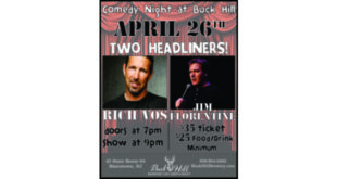 Blairstown: Comedy Night – Two Headliners – Rich Vos and Jim Florentine is happening at Buck Hill Brewery & Restaurant Nicole from Buck Hill Brewery & Restaurant said on Thursday, April 26 from 09:00 pm to 11:00 pm Doors open at 7pm – Show starts at 9pm – $35 ticket – $25 food/drink minimum – call to ...