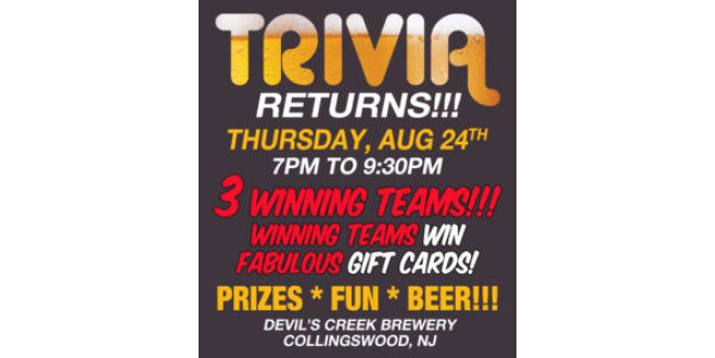 Collingswood: Trivia Night @ The Creek is happening at Devil’s Creek Brewery Kathy from Devil’s Creek Brewery said on Thursday, August 24 from 07:00 pm to 09:30 pm It’s Trivia time again! If you love trivia, you’ll love our version! Three really challenging rounds! Who will win??!! Three teams will be awarded Devil’s Creek Gift Cards at the end! PLUS, over 12 beers on tap in our rustic, welcoming taproom. Cheers! More information can be found at http://www.DevilsCreekBrewery.com. More information can be found at https://www.facebook.com/DevilsCreekBrewery. $1 off growler fills for NJCB Members.