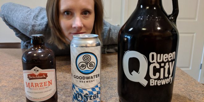 Have you heard? Fall is here. Actually, at the time of writing this it seems we’ve already moved on to winter here in Vermont. But during a recent weekend, with a crisp chill in the air, we set out to try some of Burlington’s falliest beer. We were hunting for one particular style: the Märzen. According to the BJCP style guidelines, märzen is “[a]n elegant, malty German amber lager with a clean, rich, toasty and bready malt flavor, restrained bitterness, and a dry finish that encourages another drink.” But on this day, we didn’t set out to find the “ideal” märzen. We set out to gather a few of the ones that were immediately available from Burlington-area breweries and see which one we liked the best with our very subjective opinions and limited knowledge. Now, meet our contenders, photographed in an attempt to be fancy and festive: Queen City