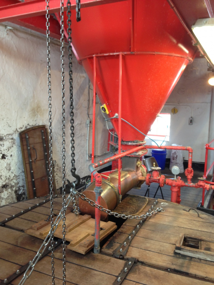 The sacks of grain used to be pulled through hatches to the top floor where the Grain Mill is located, this in turn feeds by gravity into the Mash Tun on the level below. Next to the Mash Tun is a Hot Liquor Tank for heating the mash and sparge water. Once mashing is complete the wort flows via gravity into the Boil Kettle located below the Mash Tun.