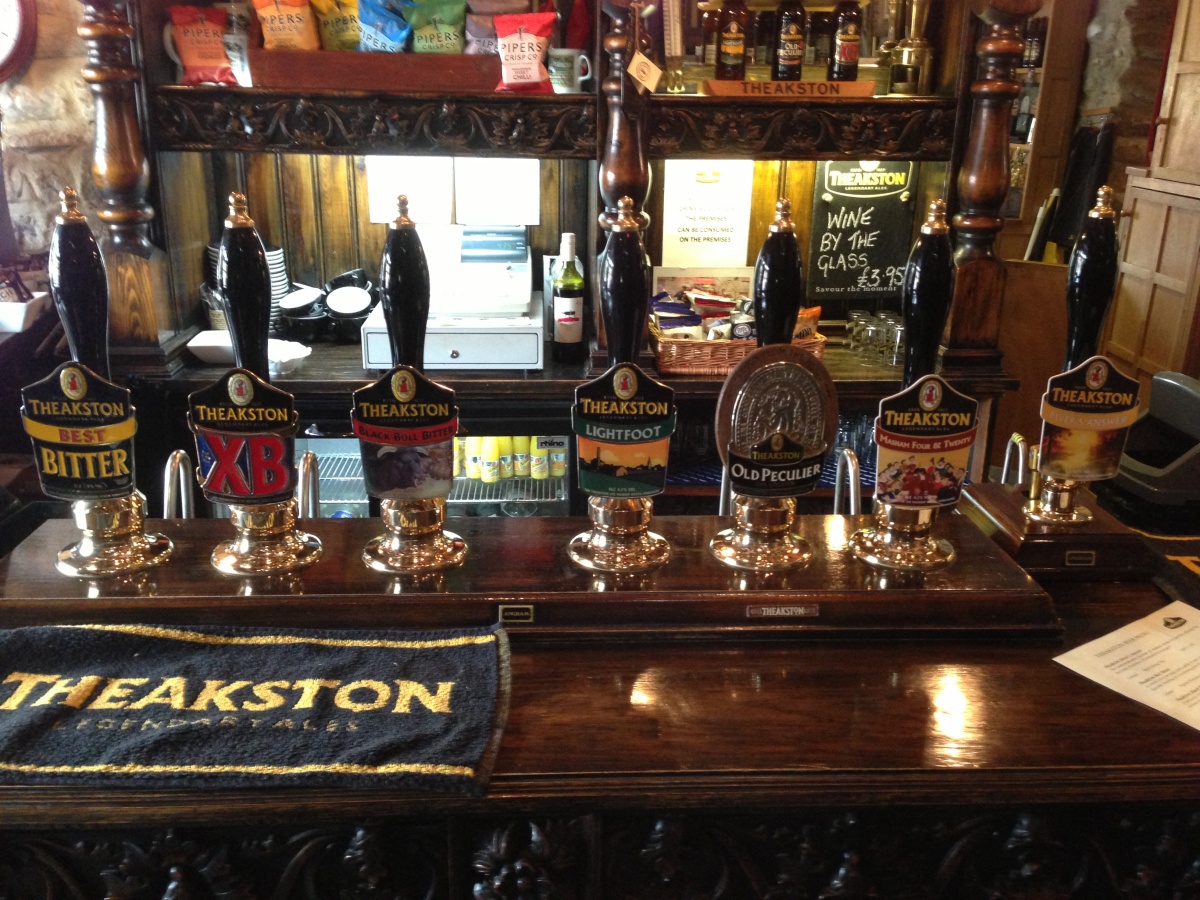 After Tadcaster we moved onto the small town of Masham, just outside of Ripon, to visit the Theakston’s Brewery. Once we had parked the car and paid 50p for parking in the honesty box we followed the signs to the Theakston’s Visitor Centre. The path winds past a row of 10 feet high hops and is situated inside the Black Bull Pub. A tour is priced at GBP 6.75 each and includes a pint of beer or 2 halves or 3 thirds. As there were two of us and 6 main beers on tap we opted for 6 x 1/3 pints (or large samplers).